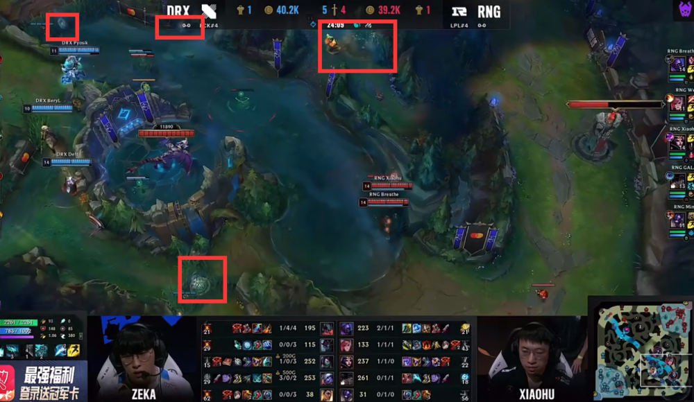 随后的时间里,RNG整场都在处理一个关键的麻烦,树儿子,大家可以看下图,所有红框的位置,都是大树儿子所在的位置,即便大树伤害不高,但他所提供的视野,几乎让RNG众人无处遁形,也因此,他们的小龙团,总能获得更好的站位。