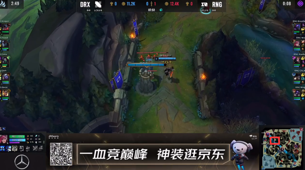 第二个问题,我们将跟随比赛的节奏,逐步为大家揭秘。这场比赛的前期,几乎是RNG的对线教学局,三路都对drx形成了压制,这也是我们赛前预测的本局比赛的正确走向,因为drx的个人能力就是弱于RNG的。