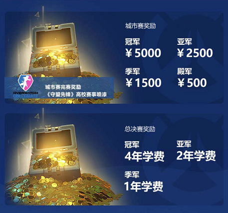 守望先锋比赛的报名则需要6名队员一起,比赛流程相对简化,分为城市赛和总决赛。其中城市赛冠军可以获得5000RMB奖励,并获得晋级总决赛的资格。总决赛的冠军(6名成员)可以获得4年学费奖励,亚军(6名成员)可以获得2年学费奖励,季军(6名成员)则是1年学费奖励。