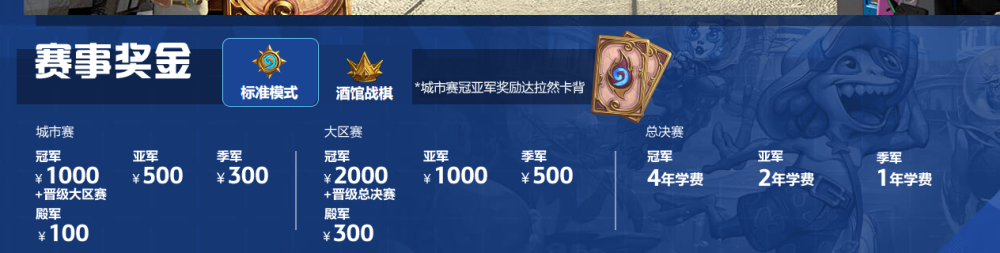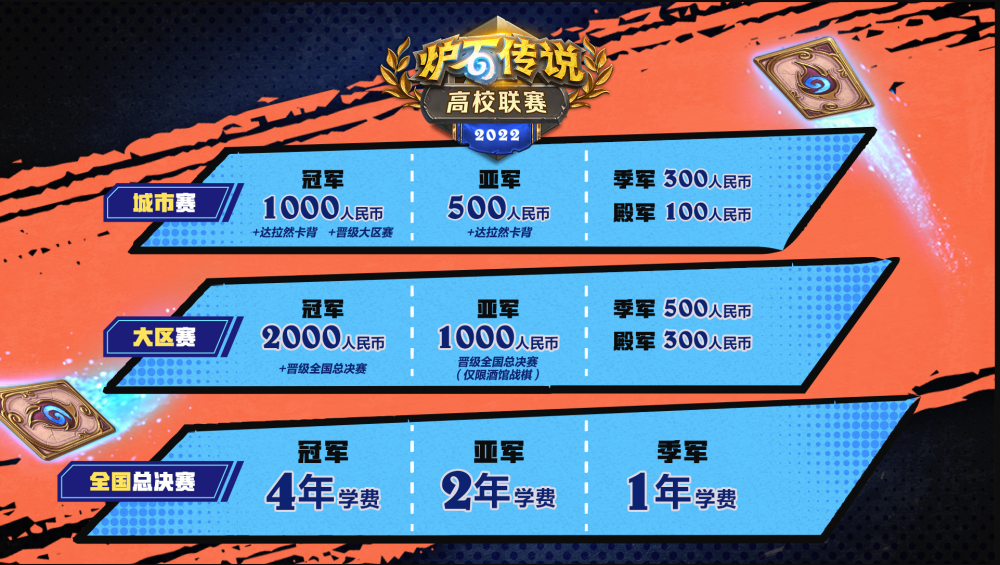 《炉石传说》和《守望先锋》在高校联赛秋季赛的奖励都很丰厚。《炉石传说》总共分为城市赛、大区赛和全国总决赛三重选拔,每个阶段的奖励都层层递进,在城市赛拿到冠军就能够得到一千的现金奖励、达拉然火焰卡背,还有晋级大区赛的资格;而在大区赛的冠军可以得到两千的现金奖励,还有晋级总决赛的资格;在全国总决赛中拿到冠军,更是可以赢得四年的学费!