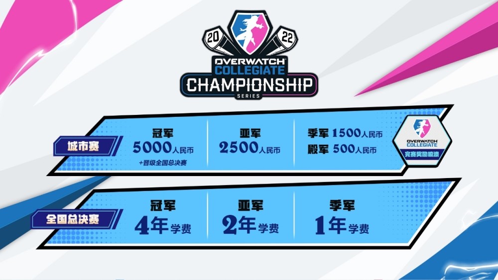 《守望先锋》也同样不遑多让,总共分为城市赛和全国总决赛两个阶段,在城市赛中拿到冠军可以得到五千的队伍奖金,而在全国总决赛中得到冠军,那么同样可以免四年学费。
