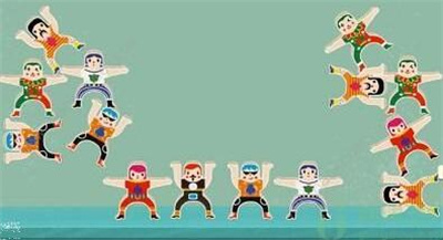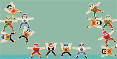 3、第二排右边放红衣小人,中间放两个黄条纹衣小人,左边放绿衣小人;
