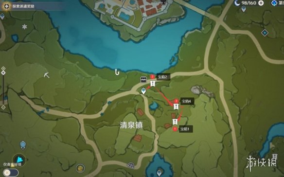 第一条路线,收集清泉镇周围的宝箱。收集宝箱的顺序是2→4→1。