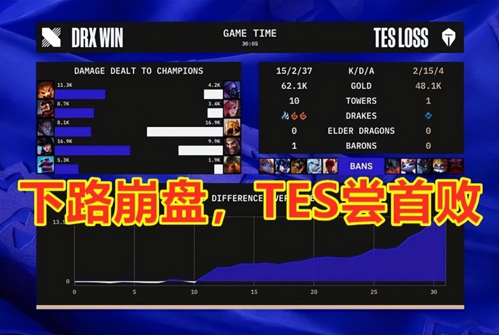 如果抛开BP不谈的话,坦率地讲这一场比赛的胜负,和囧王者赛前预测的差不多,胜负手还是在中下双C的位置上。DRX将突破口放在了下路双人组身上,他们从比赛的第10分钟开始,就连续三波抓下,直接导致TES下路崩盘。而阿水在拿到了德莱文之后,也是过于自信,走位激进。在冒进被对面双杀后,明知道对面会开启抓下模式时,依旧没有及时调整思路,成为了本场比赛最大的背锅位。