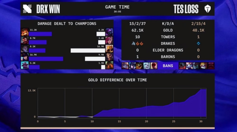 此后TES在中路右侧位置与DRX爆发团战,沙皇虽然进场效果很好,但还是被DRX轻松击败,破路然后拿下了大龙。
