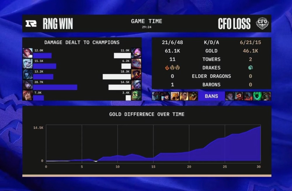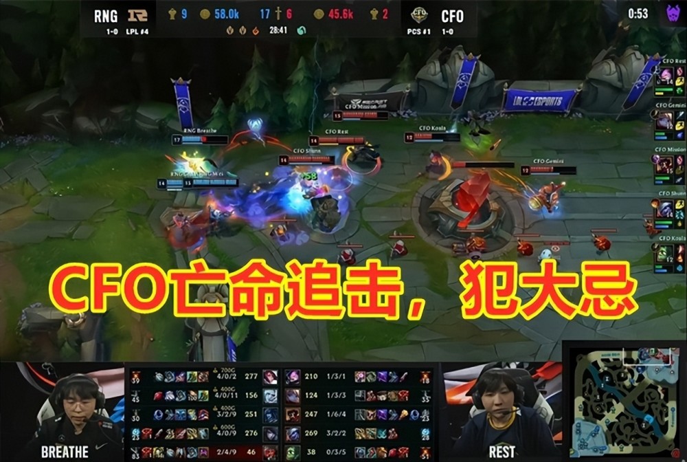 对于CFO而言,他们在比赛的最后阶段,本来有最后一丝残喘的机会的。可惜,他们犯了“盲目追击经济优势一方”的大忌。28分钟左右,RNG上路抱团推进,CFO集火了小明后,少人的并残血的RNG选择战略后撤拉扯CFO,结果CFO果然是上当。最后由GALA闪现进场,打出成吨AOE伤害后,RNG轻松在30分钟内结束战斗!
