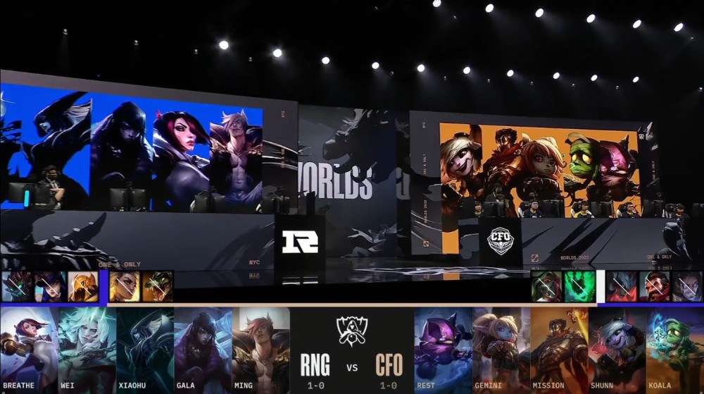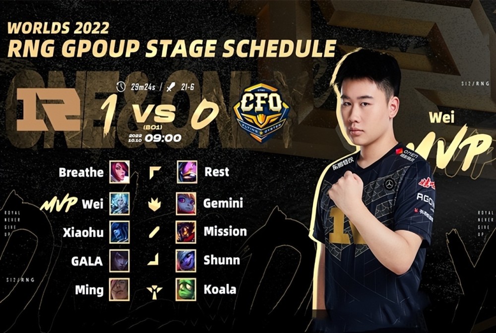 RNG和CFO的BO1:RNG蓝色方,禁用大树、女警、沙皇、芮尔、鳄鱼,选用Breathe剑姬、Wei佛耶戈、Xiaohu丽桑卓、GALA厄斐琉斯、Ming腕豪;CFO红色方,禁用塞拉斯、男枪、剑魔、锤石、烈娜塔,选用Rest凯南、Gemini波比、Mission维克托、Shunn小炮、Koala阿木木。