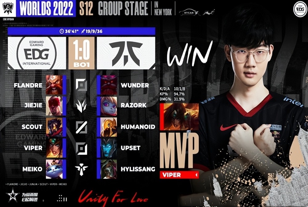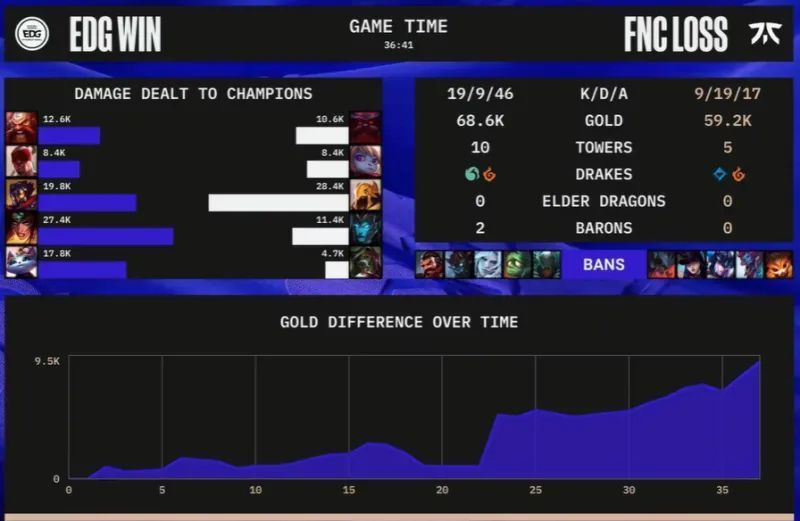尽管FNC在18分钟左右的小龙团中,打出了一波3换5的好团,搬回了些许劣势,但是在4分钟后,EDG就以一波0换4的完美团,还以颜色,并斩获大龙。最终36分41秒,EDG奥恩先手开团,沙皇无力回天,EDG大获全胜一波终结比赛。