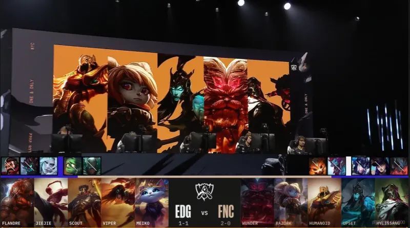 EDG对阵FNC的BO1:EDG蓝色方,禁用男枪,大树,破败之王,阿木木,派克,选用Flandre酒桶、Jiejie盲僧、Scout维克托、Viper希维尔、Meiko猫咪;FNC红色方,禁用剑魔,女警,猪妹,巨魔,纳尔,选用Wunder奥恩、Razork波比、Humanoid沙皇、Upset滑板鞋、Hylissang烈娜塔。