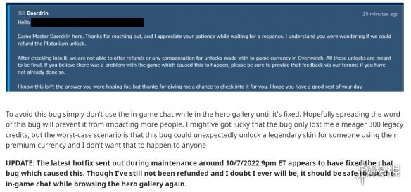 暴雪相关人员之后在回复Dracyoshi时表示“我们无法为在《守望先锋》中使用游戏内货币进行的解锁提供退款或任何补偿。所有这些解锁都是‘最终结果’”,他们还补充道:“如果你认为是游戏的问题导致了这一切,请一定要通过我们的论坛提供反馈我知道这可能不是你想要的答案,但谢谢你给我们一个机会来为你检查它。我希望你今天休息得愉快”,然后就没有下文了。