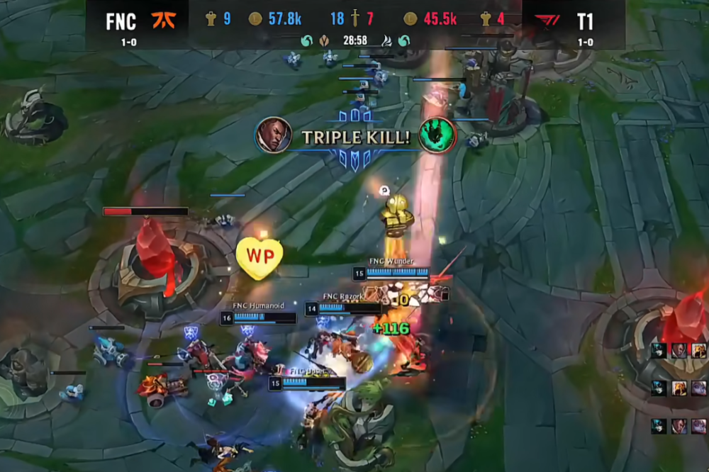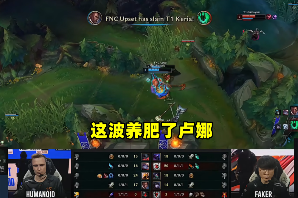 然而Oner的一波追击过深,T1下路组合的葫芦娃救爷爷,却被FNC打出1换2,,拿到了不小的优势。Gumayusi也是直言看到这一波打完,卢锡安回家出完装备之后,就知道劣势很大了。在这种情况下,T1改变了战略,选择从上路的Wunder寻找突破口,实际上他们也成功了,Wunder的剑魔被抓成了0-2。但无奈卢娜组合的爆发伤害太高了,波比的定墙以及限制位移,大大限制了T1阵容的发挥。