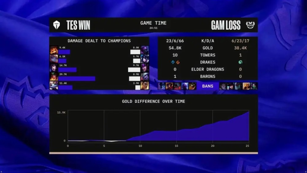 开局双方平稳发育,没有爆发人头。前期9分钟,GAM四人入侵TES野区,Tian波比极限反应拦断GAM Bie芮尔进场,knight狐狸和JackeyLove希维尔在后打出成吨输出,TES 0换4击溃GAM。中期TES频繁利用野区和边路团战击杀GAM多人,成功滚起雪球。22分钟,TES众人在野区击杀GAM Levi瑟庄妮后,无压力拿下大龙。后期24分钟下路高地团,TES凭借巨大装备优势伤害碾压1换4取得团战胜利,随后带着兵线一波终结比赛,拿下首秀胜利!