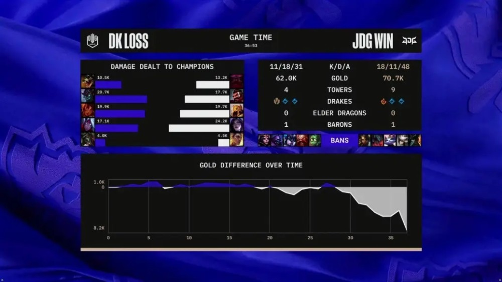 开局4分钟,DK Canyon大树野区闪现控住JDG Kanavi男枪,deokdam维鲁斯赶来补上伤害击杀男枪,率先拿到一血。前期6分钟双方在下路爆发团战,JDG Yagao沙皇大招推回DK三人,Hope卡莎和Kanavi男枪进场完成收割,JDG 1换3取得团战胜利。中期双方频繁发生团战,各有大量人头进账。23分钟中路团战,DK ShowMaker岩雀大招切割战场,配合deokdam维鲁斯高额伤害,DK 0换2击退JDG,顺势拿下大龙。29分钟小龙团,JDG Kanavi男枪拼惩抢下小龙并配合队友击杀DK Canyon大树,随后JDG强势拿下大龙。后期36分钟小龙团,JDG Hope卡莎、Yagao沙皇和Kanavi男枪完美配合,极限收割残局,JDG 2换5团灭DK,随后JDG剩余三人一波推平DK基地,赢得今日比赛胜利!