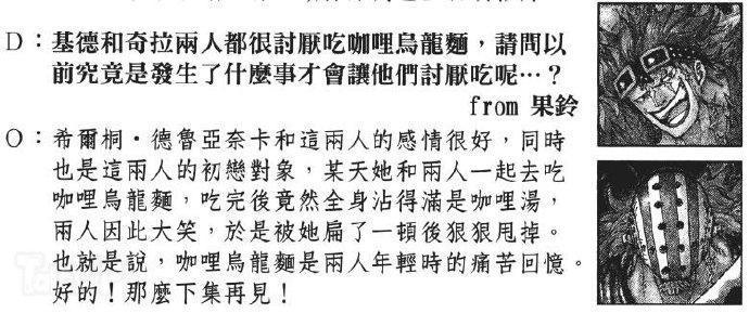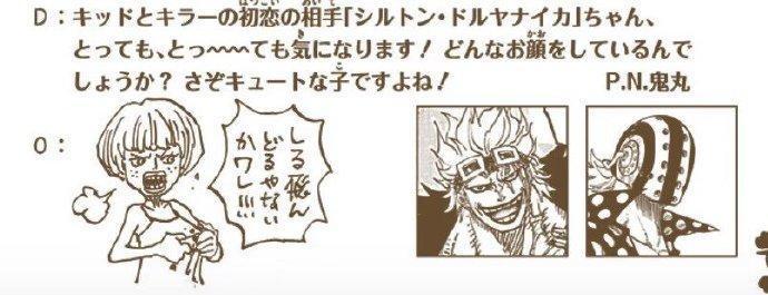 值得一提的是,那位被强盗团杀害的基德朋友名字叫“维多利亚·S(希尔桐)·德鲁亚奈卡”,她不但是基德的朋友,也是基德和基拉童年暗恋的对象。之前尾田曾经在SBS中讲过基德、基拉和维多利亚的故事。