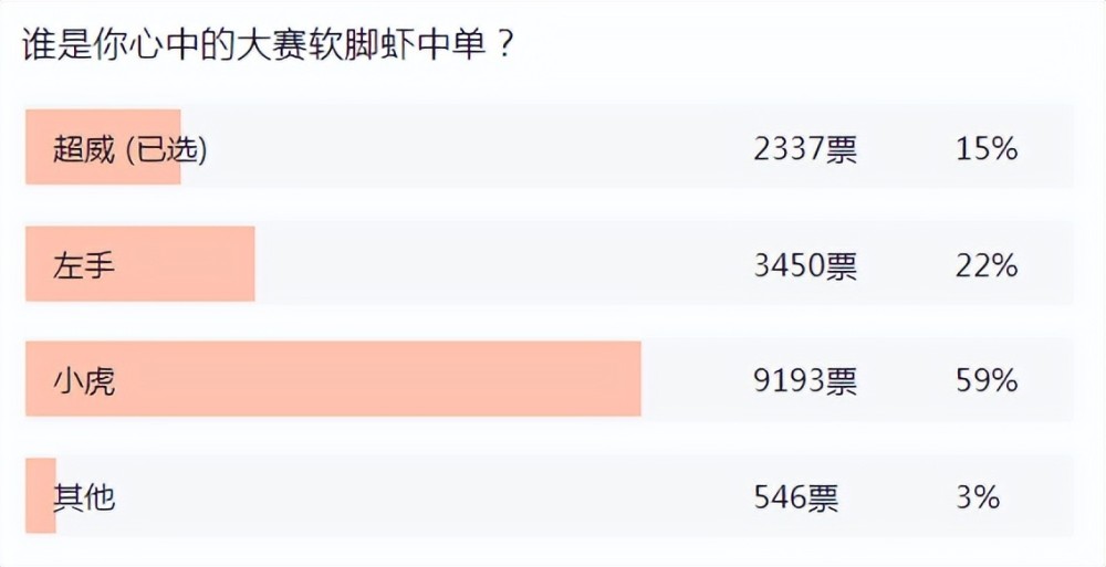 除了讨论之外,水友们也发起了S12软脚虾投票,在本次大赛软脚虾排名里面高居第一的不是chovy也不是左手,而是小虎,看到小虎的票数后,众人也是直呼真实,因为小虎的票数遥遥领先其他选手。JDG横扫RGE所有人都觉得这是正常,JDG败给T1也正常,RNG被T1横扫输掉比赛直接炸开了锅。粉丝们知道RNG会输,但是没想到会输得这么惨,几乎是全程没有组织起有效的抵抗。除了第二局前期优势,第一局第三局都是全程被摁在地上打。小虎和小明的发挥也是成为了众矢之的,同样都是老将,faker的发挥全面碾压了小虎,或许小虎这位选手还是比较适合上路吧!