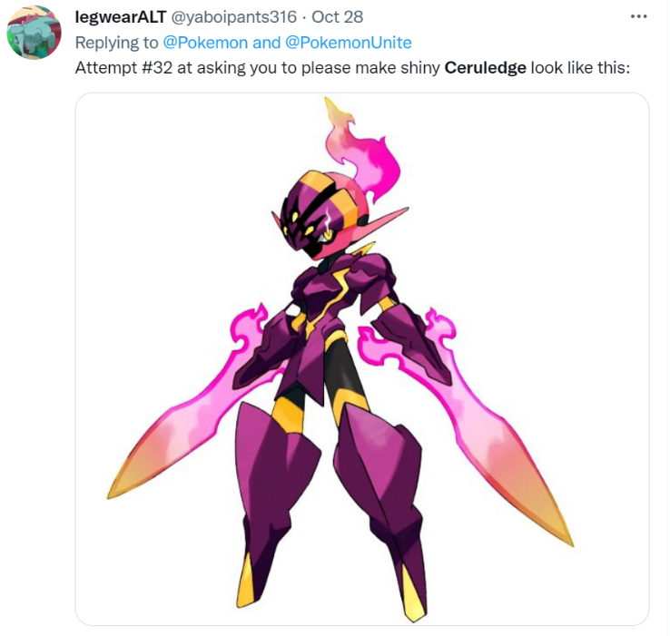 有趣的是,有位网友坚持请愿了三十三天,求宝可梦官方把苍炎刃鬼的闪光形态做成下图里的模样。