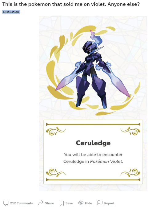 而随着游戏发售在即,在Reddit论坛上,关于版本的选择讨论再一次将焦点落在了两位人形宝可梦身上,在热烈的讨论中,有网友率先表示苍炎刃鬼就是自己选择紫版的最终理由。
