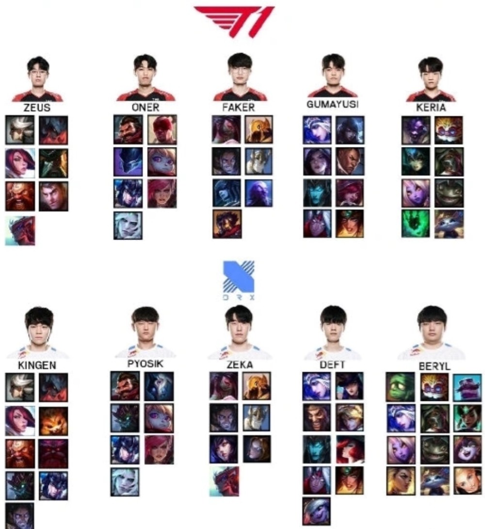 排名第二的是Kingen和Deft,用了9个不同的英雄,从英雄池表现而言,DRX甚至是要比T1更多的,可选项也更多。
