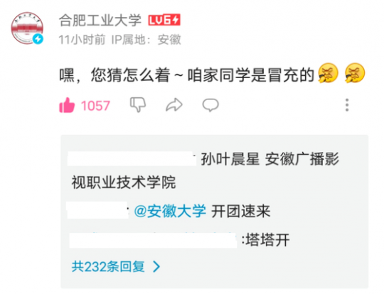 根据视频简介,投稿说唱视频的同学来自安徽大学和合肥工业大学等四所安徽高校。可评论区出现的合肥工业大学官号,却给出了不一样的反馈。直接了当地表示:“咱家的同学是冒充的。”