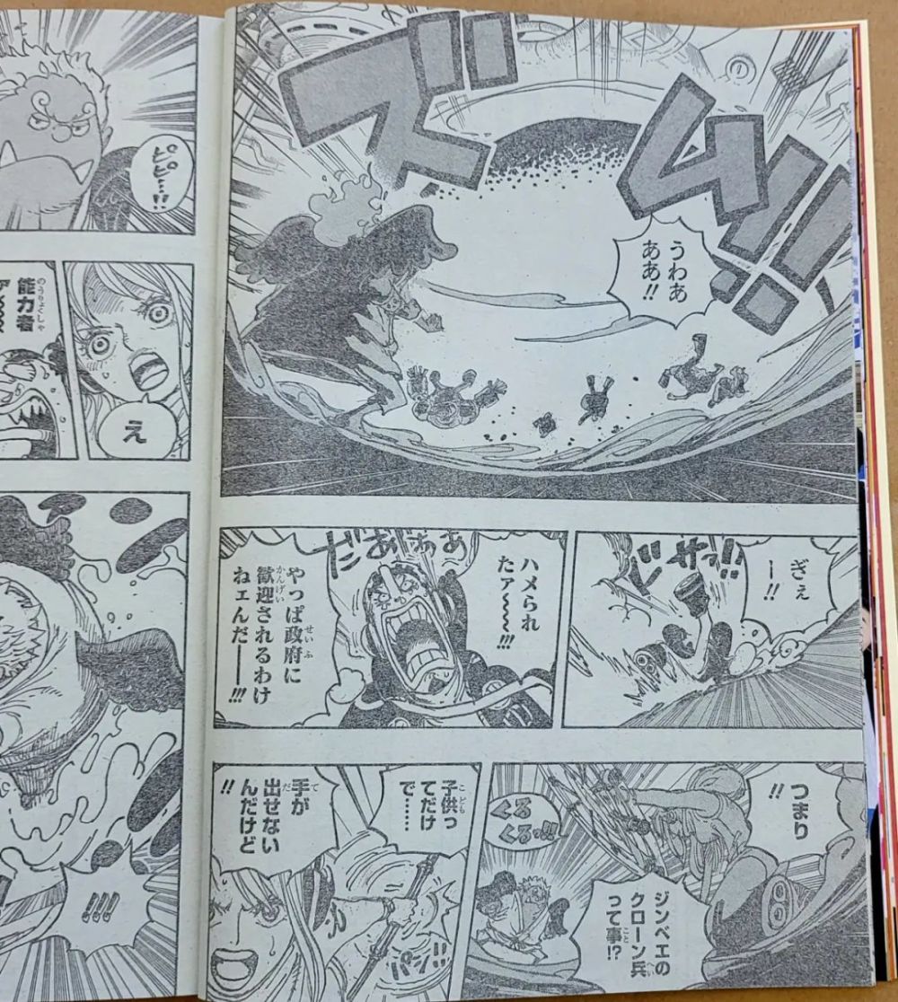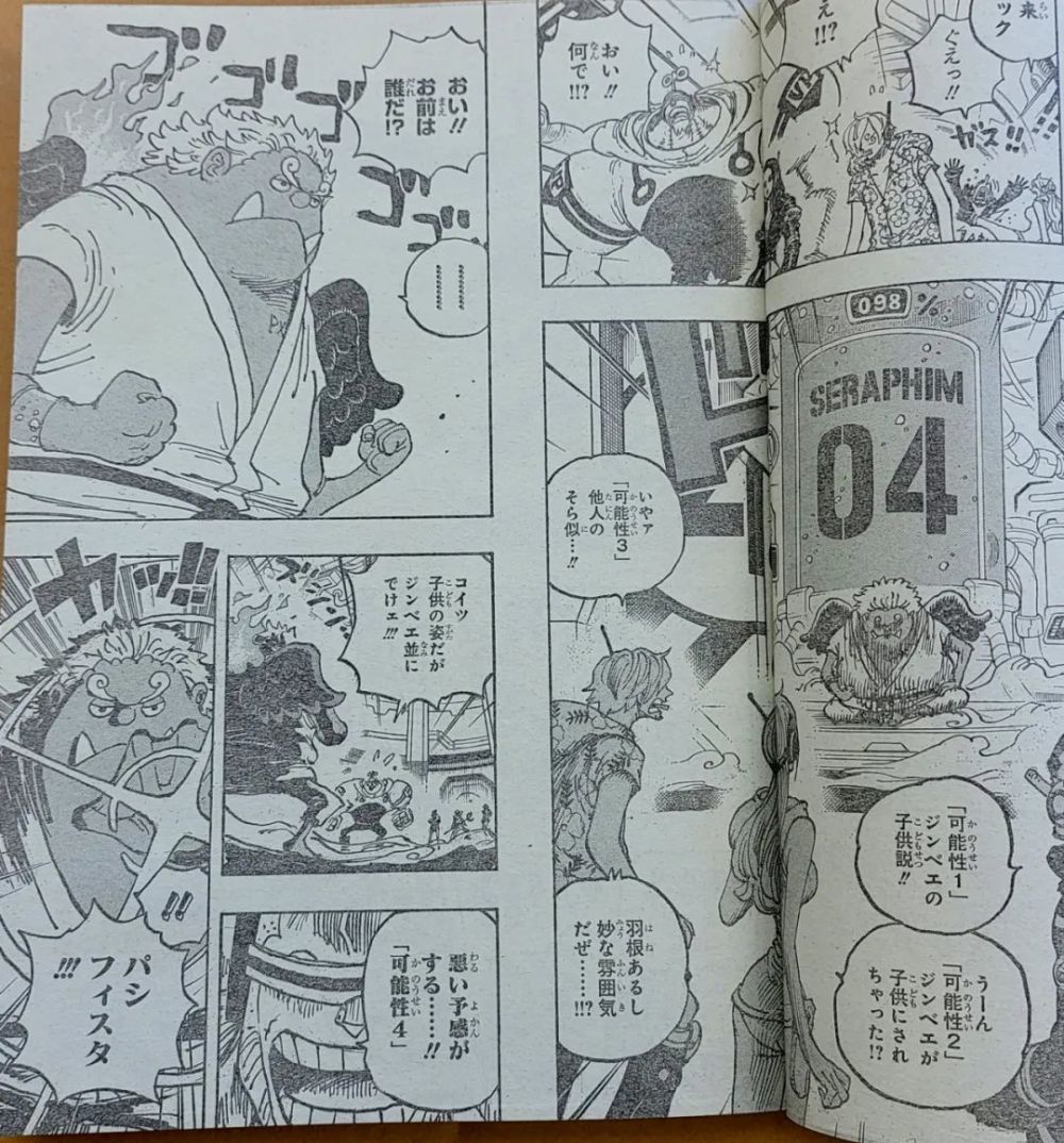 突然间,山治一行人发现了甚平版本的炽天使,于是几人纷纷开始猜测:可能性1,他是甚平的儿子,可能性2,甚平被变成了小孩子,可能性3,一个长得很像甚平的人。