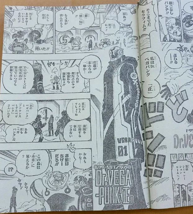 贝加庞克(正)的全身也公布了,他拥有一副人类比例的身体,头上戴着一个神秘头盔。