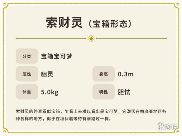 介绍在帕底亚地区新发现的宝可梦“索财灵”!以看似宝箱的外表埋伏着的是“索财灵(宝箱形态)”。它有用幽灵能量控制接近它的对象,让其收集硬币的习性哦。没有隐藏在宝箱里的另一种形态是“索财灵(徒步形态)”。这个形态只要有人接近就会马上逃跑,在帕底亚地区似乎还没有训练家成功捕捉到它……!?