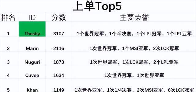 首先是上单位置,上单位置的评选中,第一名仍然是theshy,虽然他连世界赛都没有进,但是人气依然很高,虽然现在实力不再是巅峰,但是S8给LCK留下的阴影实在太大了,所以这个排名中,theshy比第二名的评分多出1000分左右拿到第一。