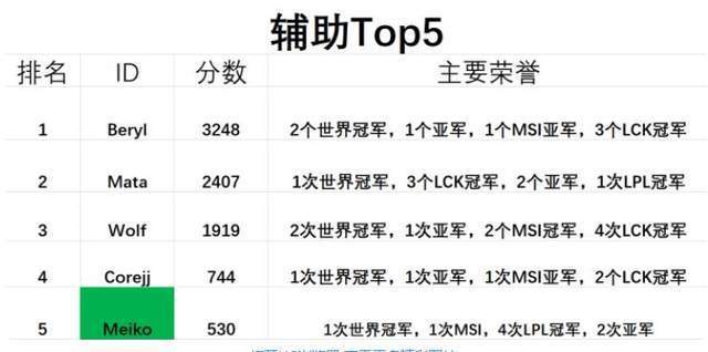 最后是辅助位置,辅助位置我们赛区只有一位选手上榜,那就是meiko,虽然上榜了,但是也只是排名第五而已。看完这些排名之后,小编已经不想说话了,虽然这次世界赛里我们没有拿到冠军,但是也不至于这么差劲吧,感觉在他们眼里我们赛区一无是处。