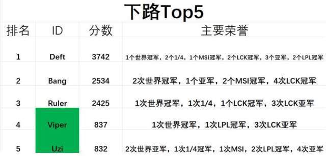 接着是AD位置,从他们评选的排名来看,我们赛区又没有排面了,曾经的王者uzi也只能排名第五,第四名虽然也是我们赛区的,但是是韩国选手viper,说实话,现在名义上还是LPL的选手,也许这个转会期就回归LCK了也不一定。