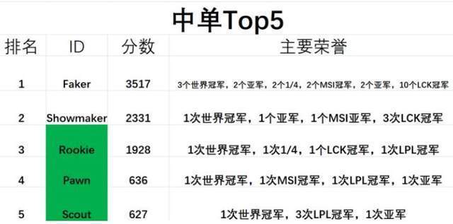 接着是中单位置,中单位置说离谱也离谱,说可以接受也可以接受,因为这个排名中,faker拿到了第一,Showmaker第二,第三名到第五名中都是我们赛区的选手,但是都是韩国选手,看来在LCK的眼里,我们赛区中的国产中单统统不够看啊。