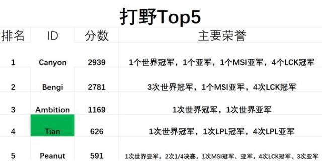 然后是打野位置的前五名,这里面Canyon是第一名,前五名里面LPL里面只有小天一人上榜,而且还是排名第四,说实话确实让人挺不爽的,但是他们拿到了今年的冠军,所以他们可以畅所欲言,我们也没有办法。