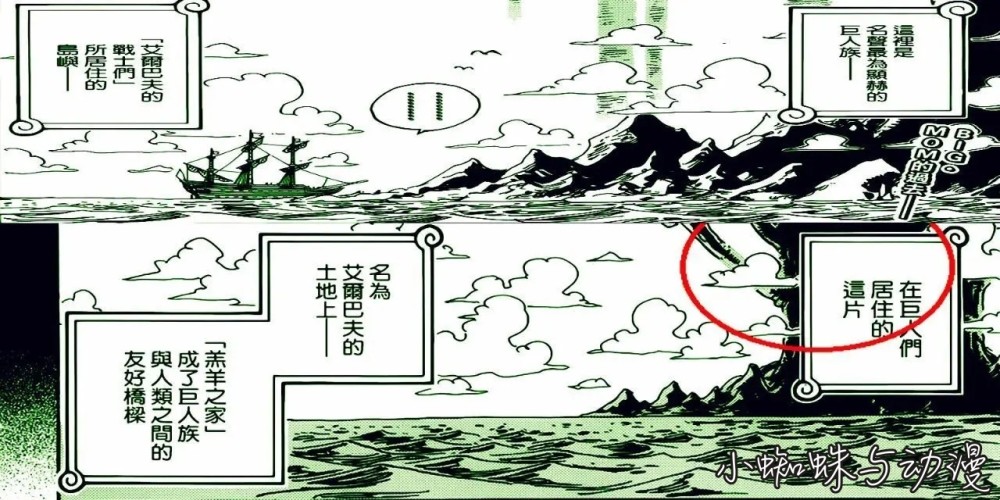 巨人岛也就是艾尔巴夫其实很早之前就已经有预告了,是一个不断在大家口中出现过的岛屿。来自巨人岛的话红鬼和青鬼,还有海军当中的那么多巨人中将。