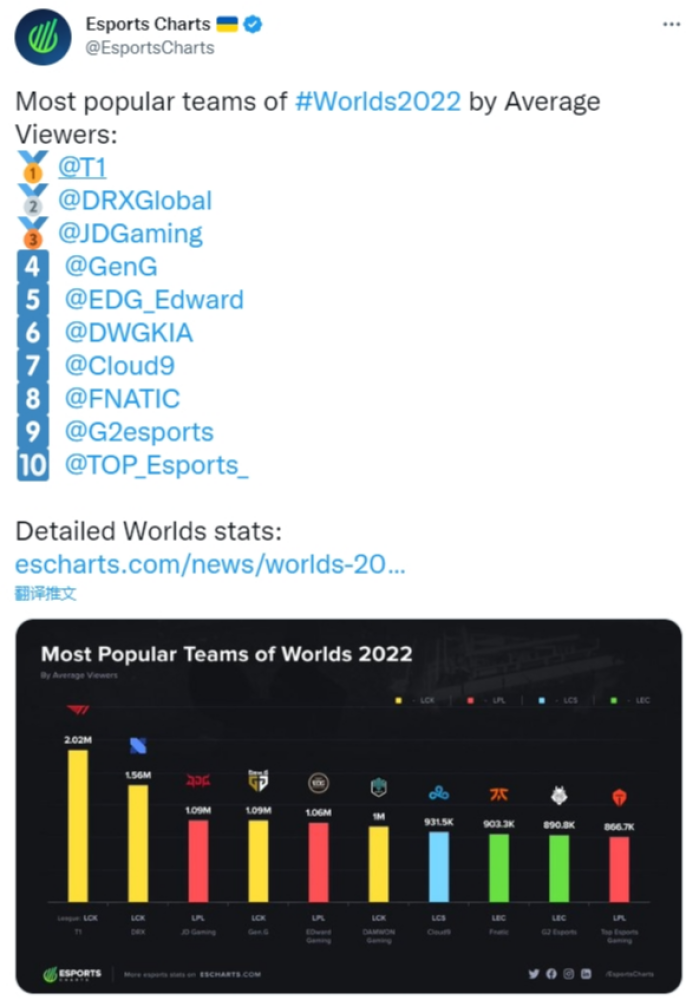 伴随着2022全球总决赛的圆满落幕,近日外媒Esports Charts分享了本届世界赛,比赛平均观众最多的战队排名(并未计算中国大陆直播平台数据)。值得一提的是,因为是比赛平均观众数,所以与世界赛参赛队伍打的比赛多少并没有直接的联系。更确切地说,应该是队伍的人气以及队伍在世界赛中的表现决定了比赛的平均观众数量。