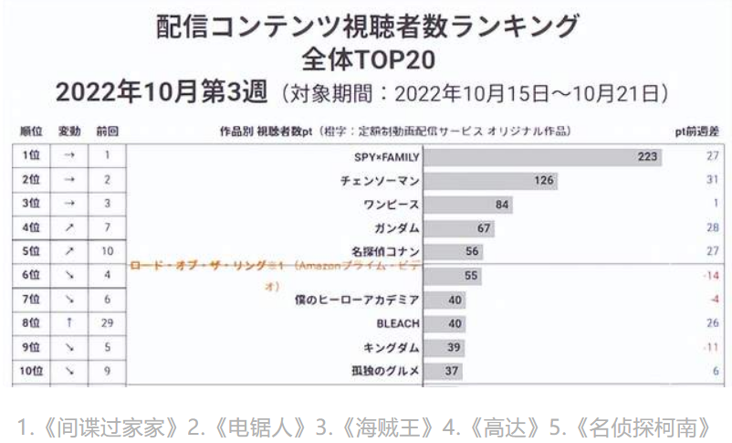 据GEM Standard统计的定额制动画配信网站(包括Abema premium、Amazon、Hulu、Netflix等18家)2022年10月视听数排行榜,《间谍过家家》连续3周占据榜首,且收看人数呈每周增长态势。