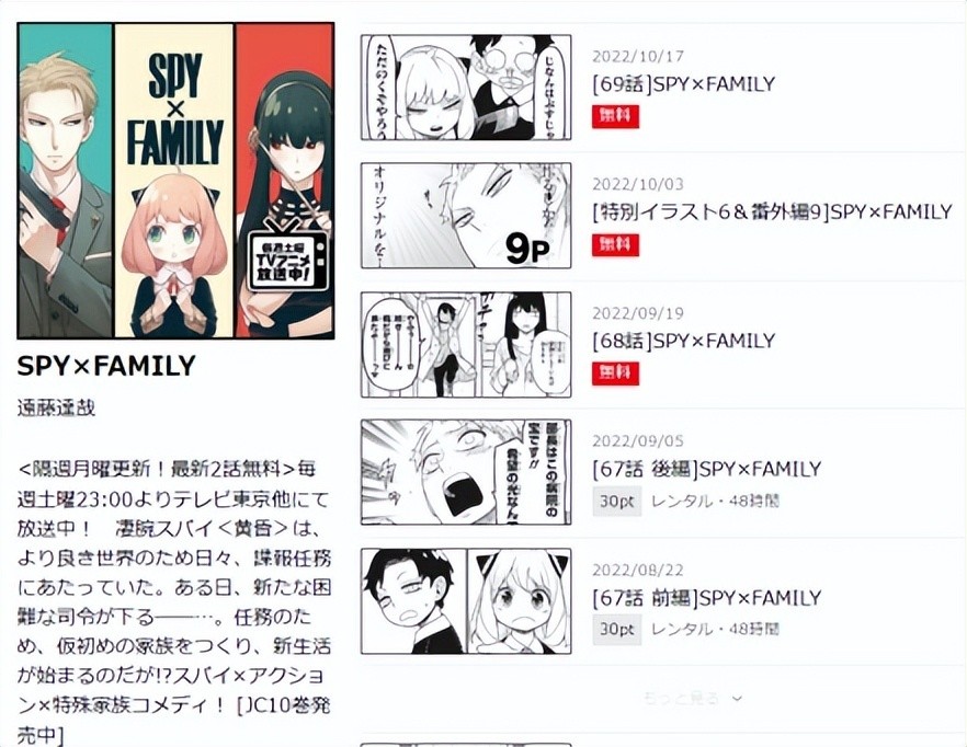 《间谍过家家》是2019年3月开始在集英社的网络漫画平台“少年Jump+”上连载的原创电子漫画,隔周更新,最新2话可免费阅读,目前已更新至69话,总浏览数超4亿,成为“少年Jump+”史上首个大热门作品,打破销量记录。