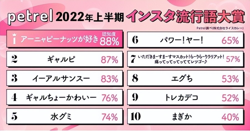 此外,动画《间谍过家家》中的阿妮亚名言“アーニャピーナッツが好き(阿妮亚喜欢花生)”还成为了2022年上半年Instagram流行语大赏第一名,可见其在年轻人中的人气之高。
