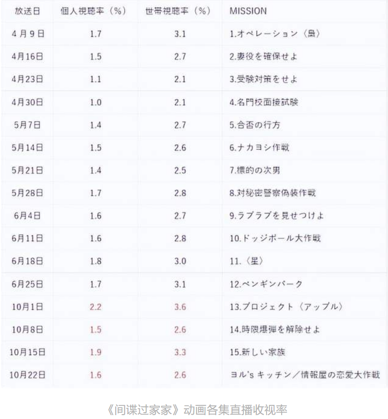 《间谍过家家》动画的制作水准是有保障的,加上漫画的热度及播出前期宣传到位,第一话拿到了东京电视台深夜档直播世带收视率3.1%的好成绩。