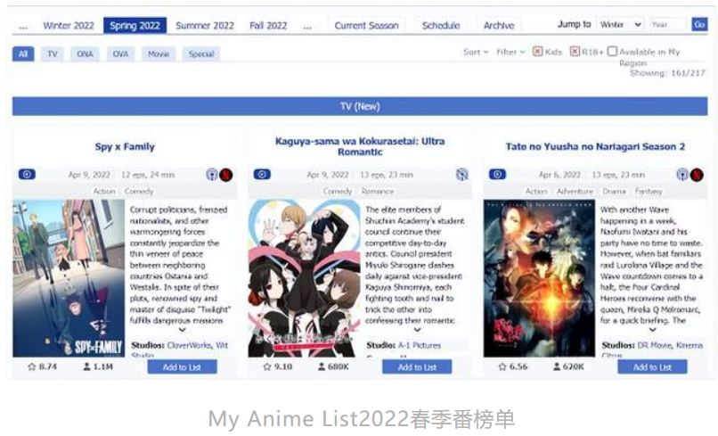 在欧美最大动漫评分网站My Anime List的动画总榜单上,《间谍过家家》第一二季目前排在42、43位,评分8.74,第一季刚开播时曾高达9分,位于季度第一。很直观的反映了在欧美的高人气。