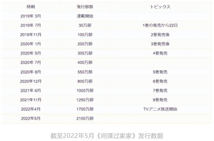 《间谍过家家》2019年7月4日开始发售单行本,连载开始仅8个月,单行本仅发行2卷,漫画销售数量便突破了100万部,在2020年1月当时,这一记录仅次于《周刊少年JUMP》的《暗杀教室》,可谓神速。