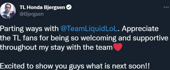 Bjergsen转发了Team Liquid的离队官宣,并表示:“感谢Liquid的粉丝过去一年如此热情的支持我。现在我迫不及待向你们展示接下来会发生什么!”