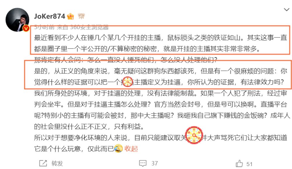 总结下JOKER的核心要点:就算这些主播开挂了,国内也没有什么和电竞有关的法律可以制裁他们。就算退一万步账号也被封。他们也可以换个号再重新东山再起。而且一个赛季有那么长也没有小赛季,换号,还是存在可以上一波大分的可能。最后他谈到了利益问题,这成年人的世界很多东西都是利益驱动的,也就是说没有需求的话,他们也不会贸然的开海克斯去直播的。