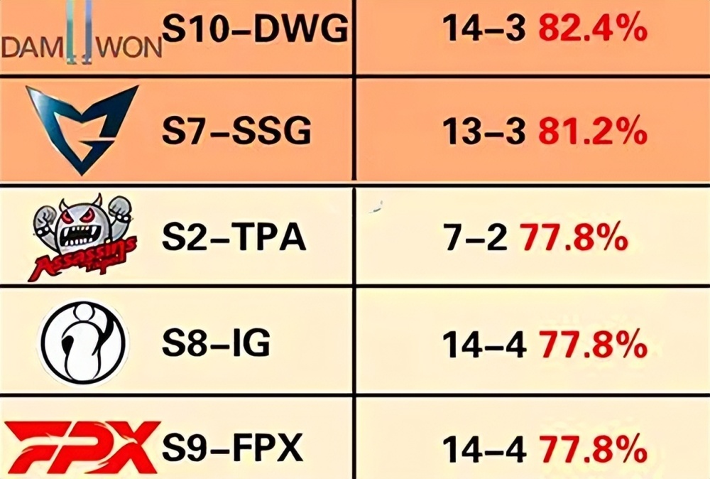 S4的DWG战队,以14-3,82.4%的胜率排名第四;S7的SSG,以13-3,81.2%的胜率排名第五;S2的TPA,以7-2,77.8%的胜率排名第六;S8的IG,以14-4,77.8%的胜率排名第七;S9的FPX,以14-4,77.8%的胜率排名第八。