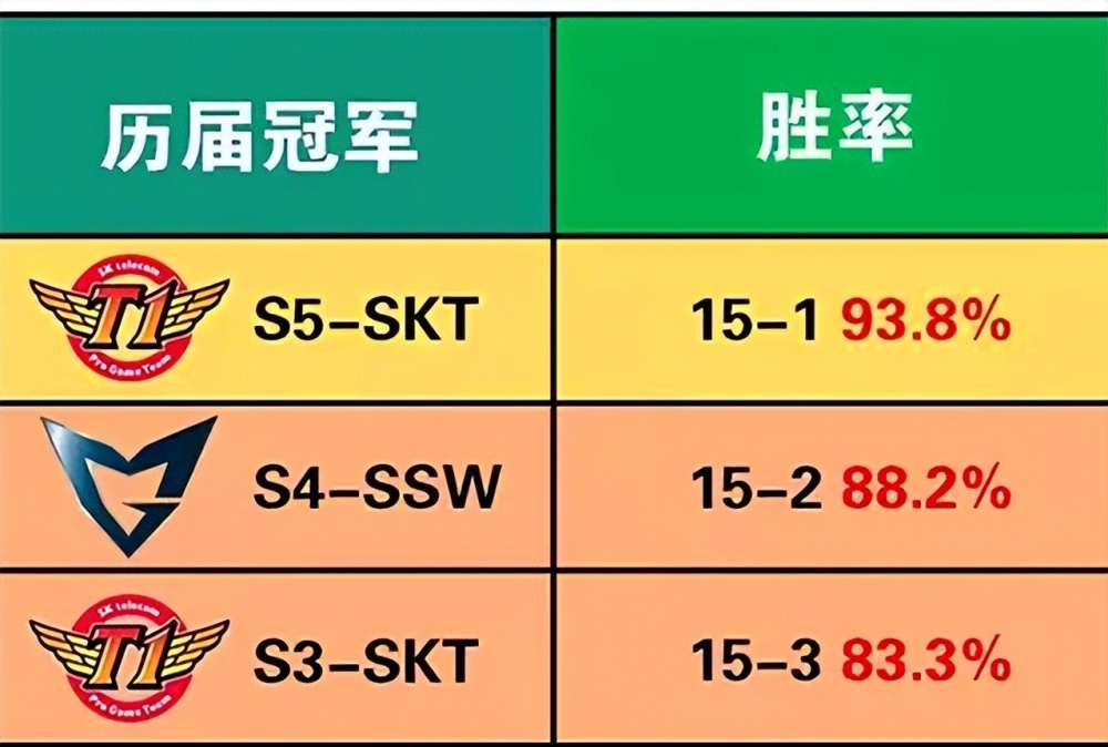 在历届S赛冠军中,S5的SKT战队,以15-1,93.8%的胜率,雄踞榜首;S4的SSW战队,以15-2,88.2%的胜率,屈居第二;S3的SKT战队,以15-3,83.3%的胜率,排名第三。