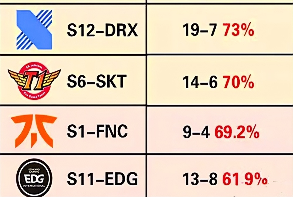 S12的DRX,以19-7,73%的胜率排名第九;S6的SKT,以14-6,70%的胜率排名第十;S1的FNC,以9-4,69.2%的胜率排名第十一;S11的EDG,以13-8,61.9%的胜率敬陪末座。