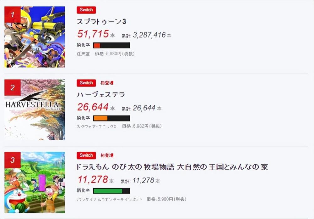 新发售的《收获之星》和《机器猫的牧场物语2》两款种田游戏分别居二、三位。