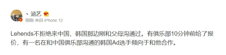 涵艺还爆料了GEN辅助Lehends不拒绝来中国,而且有俱乐部给了报价,而且有另外一名在和中国俱乐部沟通的韩国AD选手倾向于和Lehends合作。这个想和Lehends合作的韩国AD选手是在LCK还是在LPL?如果是在LPL,那肯定是Viper了。