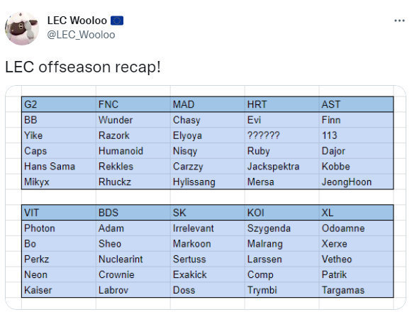 目前只有HRT的打野位置还没有确定人选,其余战队基本都已经确定了新赛季阵容。有点震惊的是LEC四位参加S12世界赛的ADC有三位没能留在LEC,G2下路Flakked,FNC下路Upset和MAD下路UNF0RGIVEN都未出现在LEC的大名单上。不过守饮水机一年后,VIT的打野Bo坐稳了首发,S13能看到Bo带队打进世界赛吗?