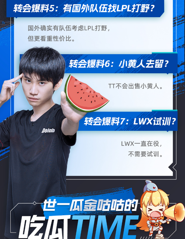 结合目前情况来看,Doinb一直疯狂打听LCK的确切消息,不断给大家吃瓜科普。加上他目前的LBL正在进行中,对手从顶级王者车队到省级冠军队,有UZI、elk、H4der、乐言、宝蓝这些实力选手助阵,目前还没有输过。不知道后续会挑战哪些强力对手,可以后续关注LBL比赛情况,吃瓜比赛两不误。