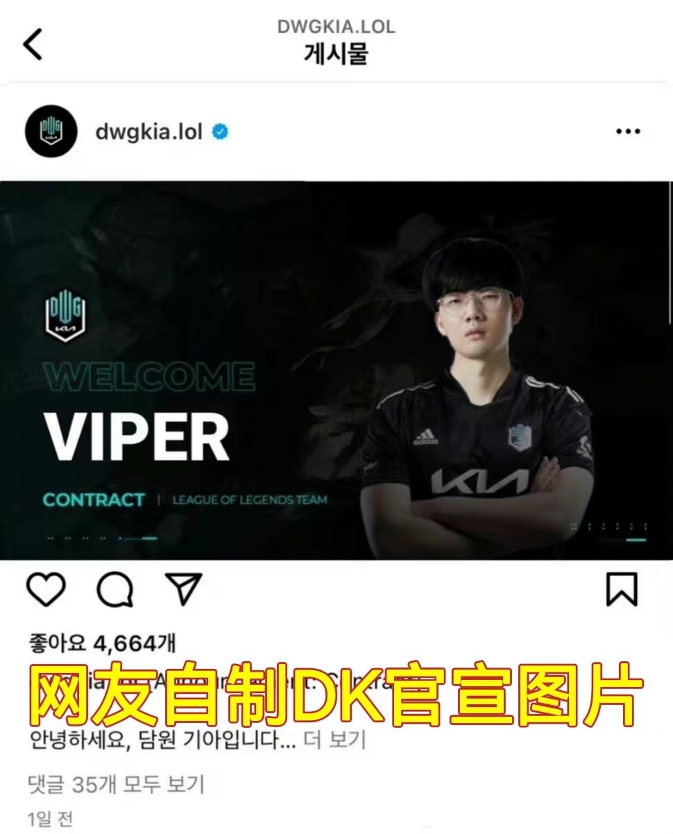 同时韩媒也高调透露,DK战队也非常中意Viper,借助此时Viper正在韩国的时机,也在努力争取拿下Viper的机会,甚至有网友开始整活,自己制作了“DK官宣Viper加入”的图片,虽然刚开始引起不少关注,但是明眼人都知道,LOL转会期还未开始,再加上像Viper这种选手,一般不会官宣很早,所以对于此图大家就一笑而过吧。