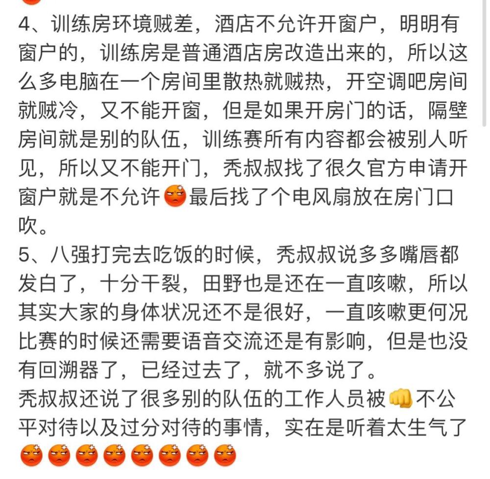 随后,他还谈到了酒店的住宿问题,官方不允许他们开窗户通风,这一点是最让我无法理解的。那么多台电脑在屋内一起打训练赛,整个的散热系统又没有那么的稳定,肯定不会有太好的效果的。总而言之,本次拳头官方的做法真的差的离谱,很多玩家也在调侃,之前的冰岛对抗做的不是挺好的嘛,每一支战队的每一名选手都照顾到了,这一次为什么出现了如此严重的问题,甚至出现选手大规模的生病。